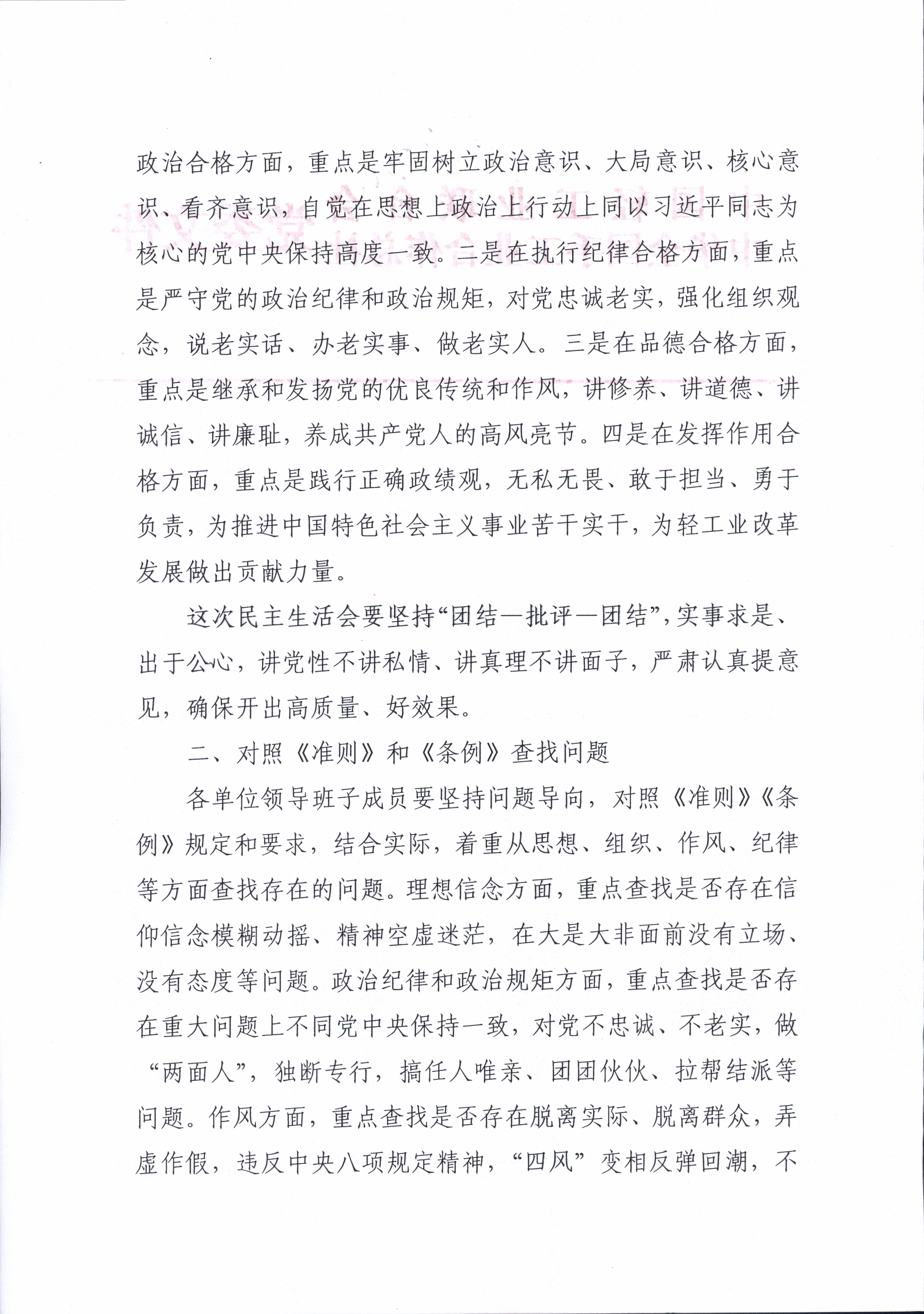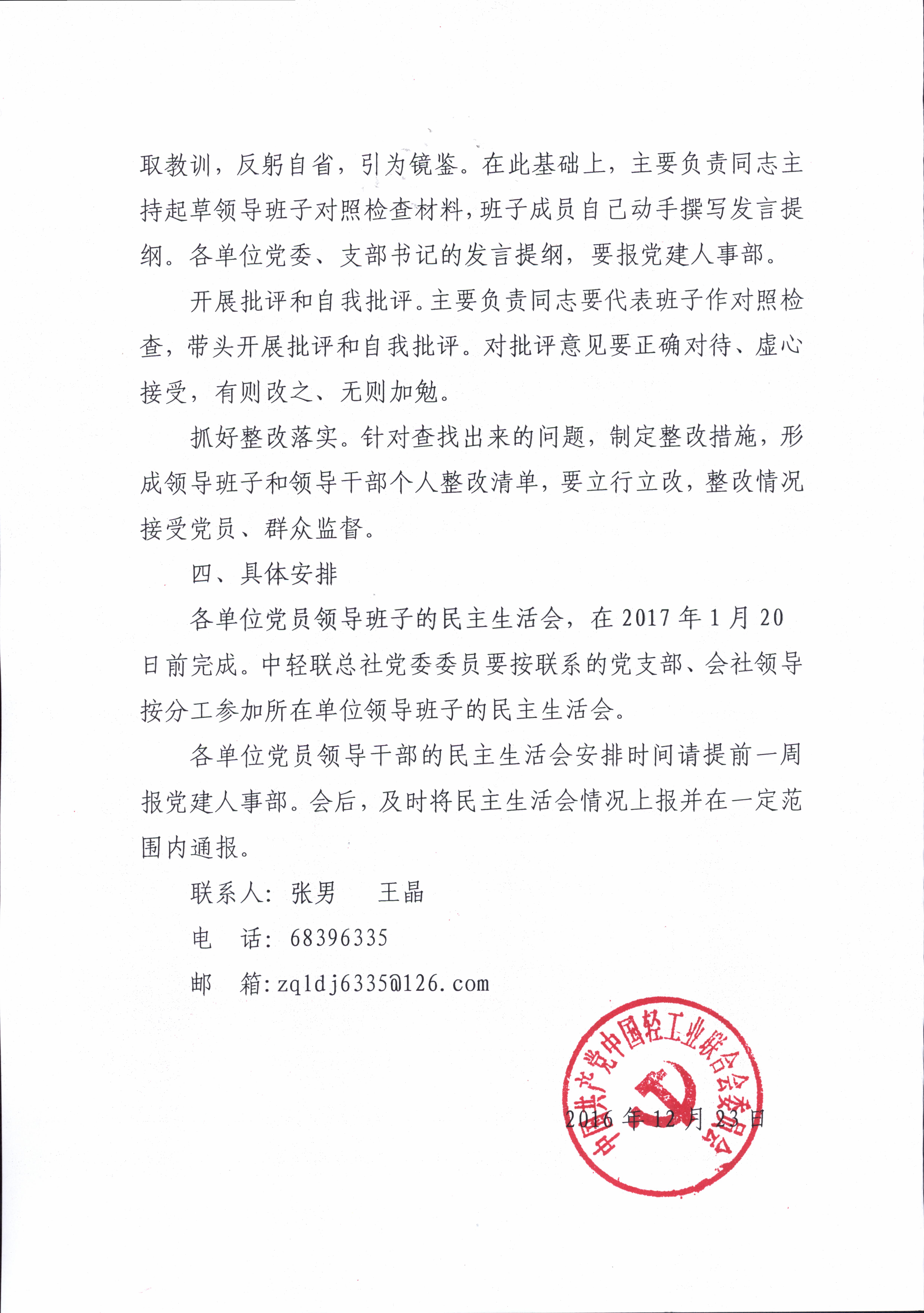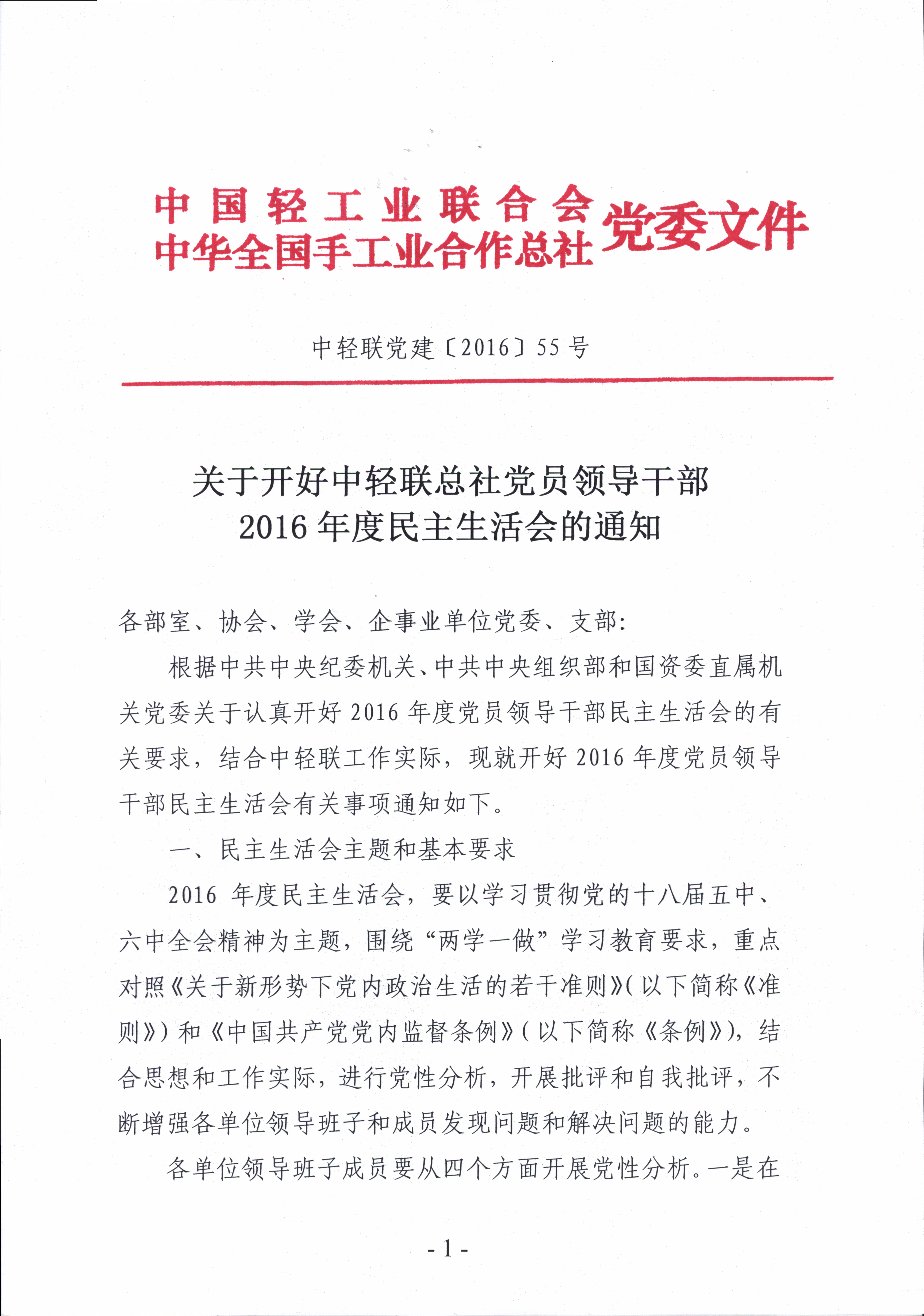 关于开好中轻联总社党员领导干部2016年度民主生活会的通知