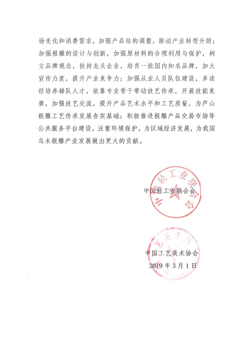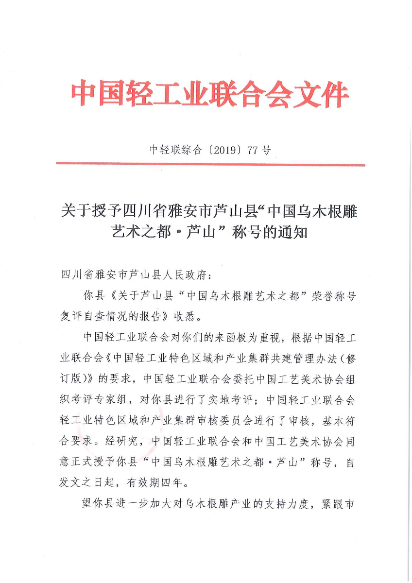关于授予四川省雅安市芦山县"中国乌木根雕艺术之都·芦山"称号的通知