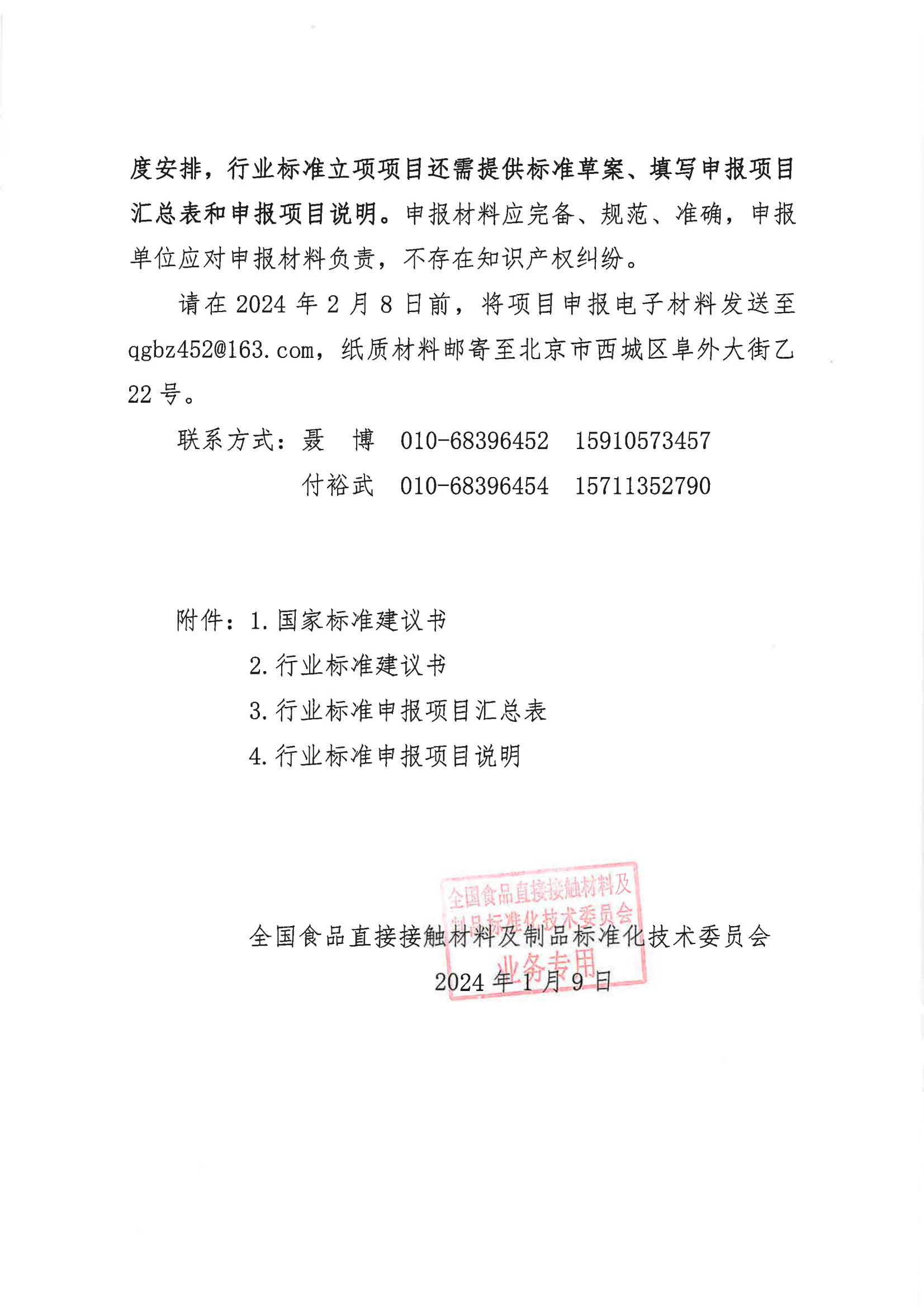关于征集2024年食品直接接触材料及制品领域标准项目的通知