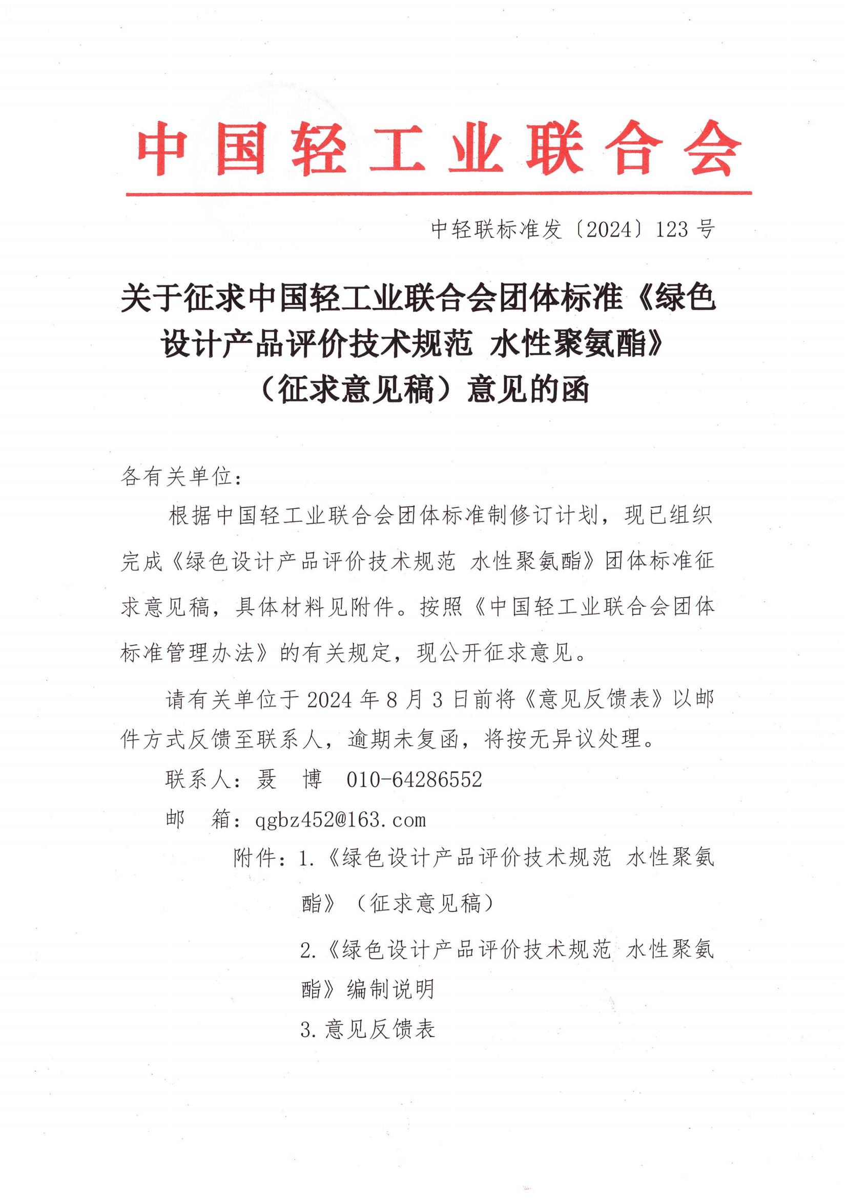 关于征求神马影院业联合会团体标准《绿色设计产品评价技术规范 水性聚氨酯》(征求意见稿)意见的函