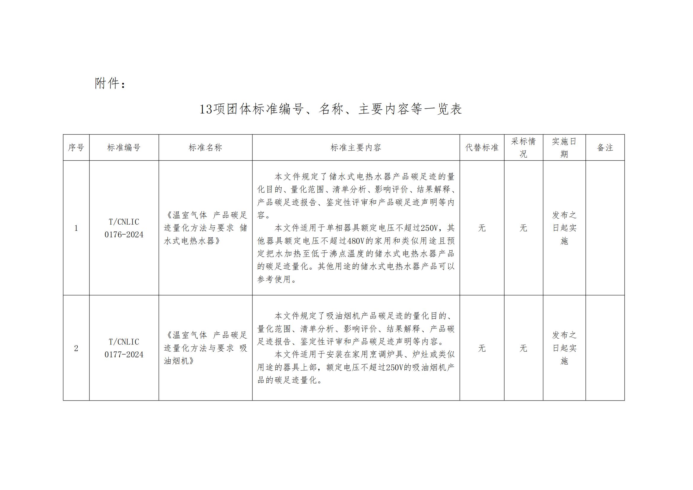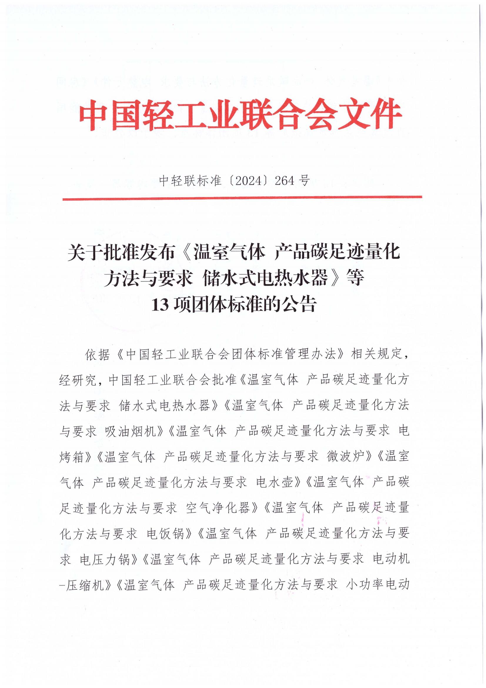 关于批准发布《温室气体 产品碳足迹量化方法与要求 储水式电热水器》等13项团体标准的公告
