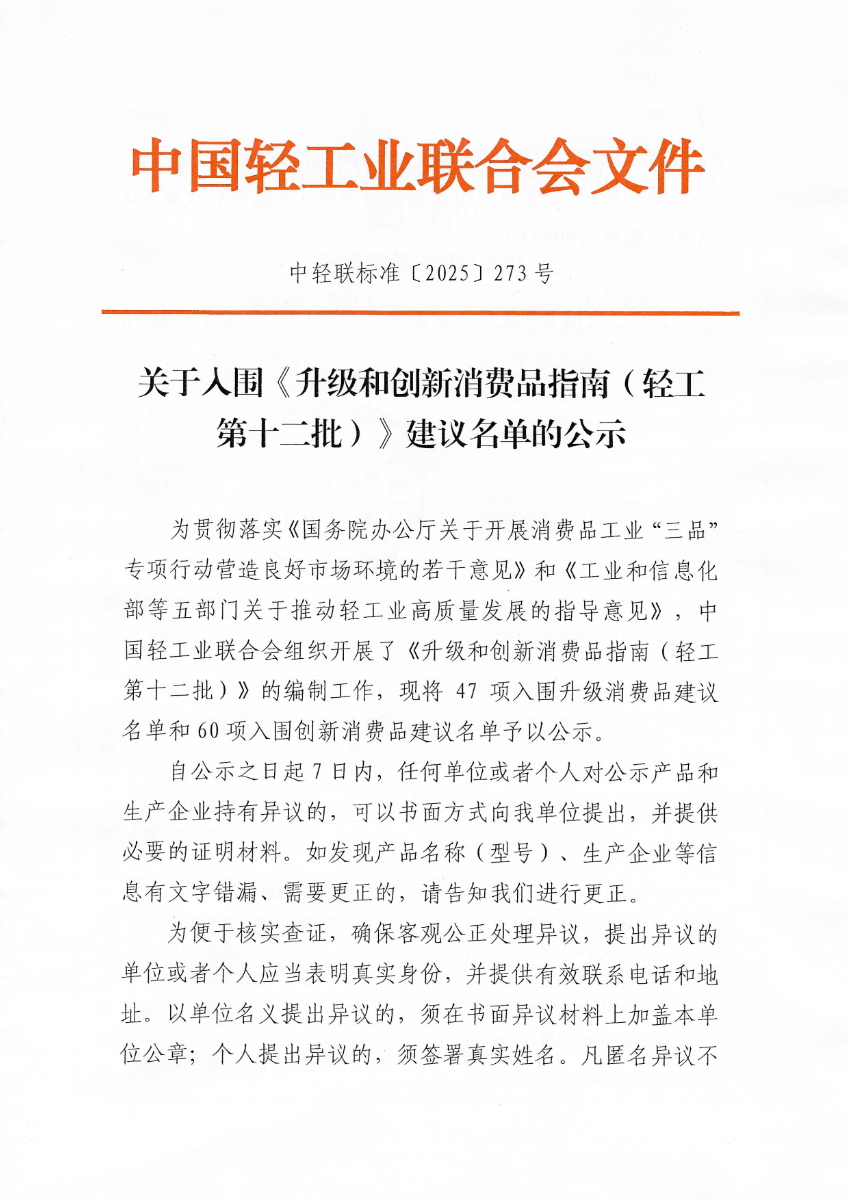 关于入围《升级和创新消费品指南(轻工 第十二批)》建议名单的公示