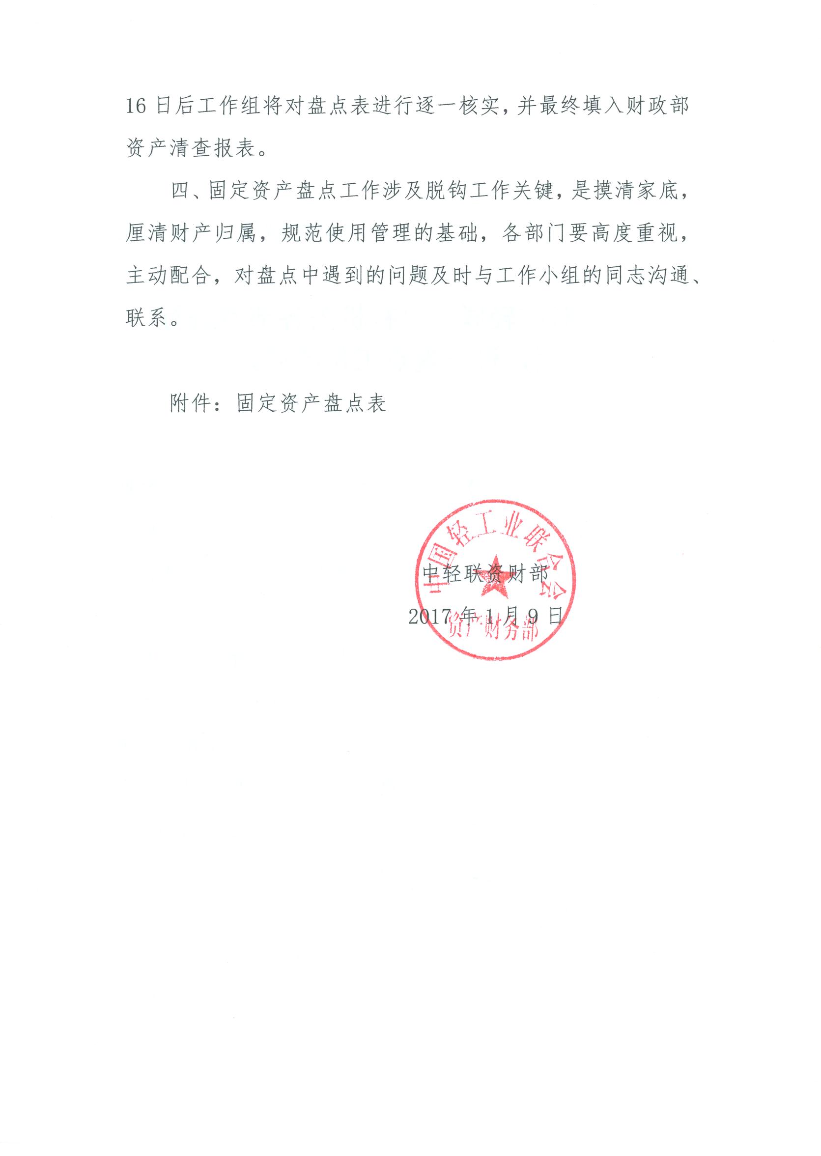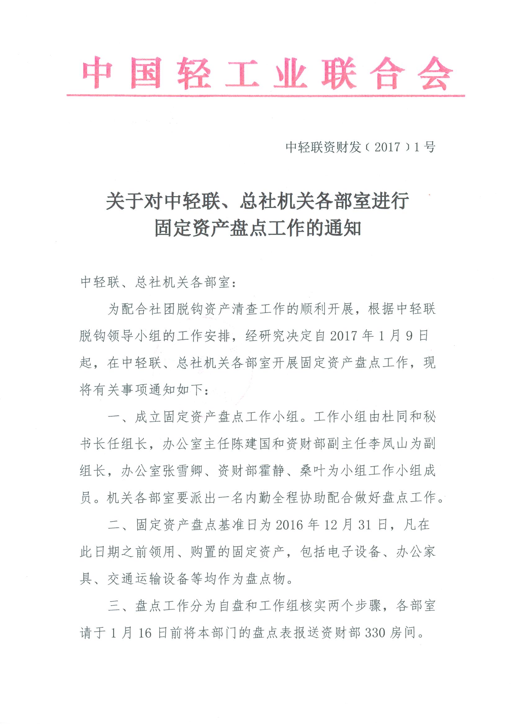 关于对中轻联、总社机关各部室进行固定资产盘点工作的通知