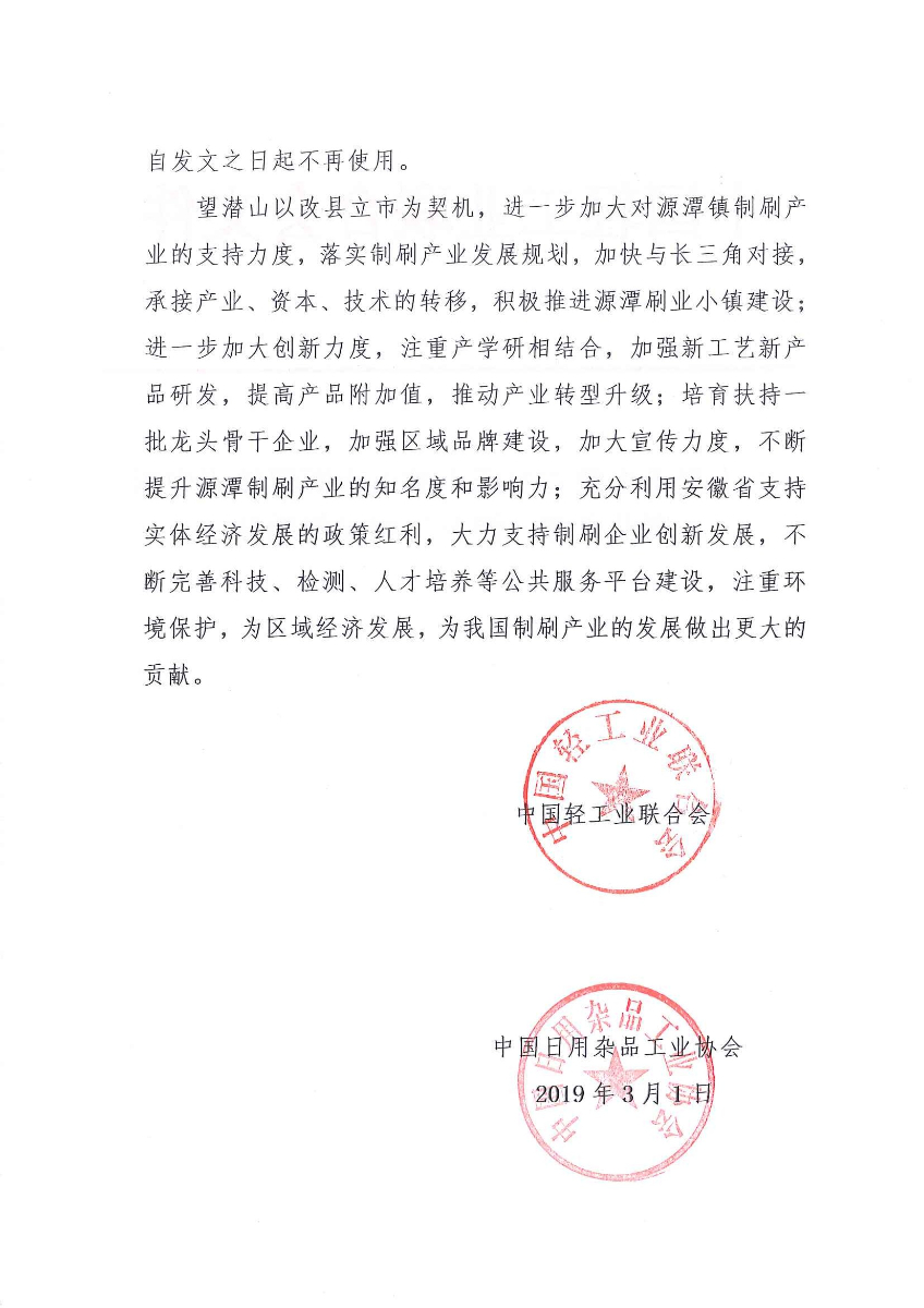 关于授予安徽省安庆市潜山市源潭镇"中国刷业之都·源潭"称号的通知
