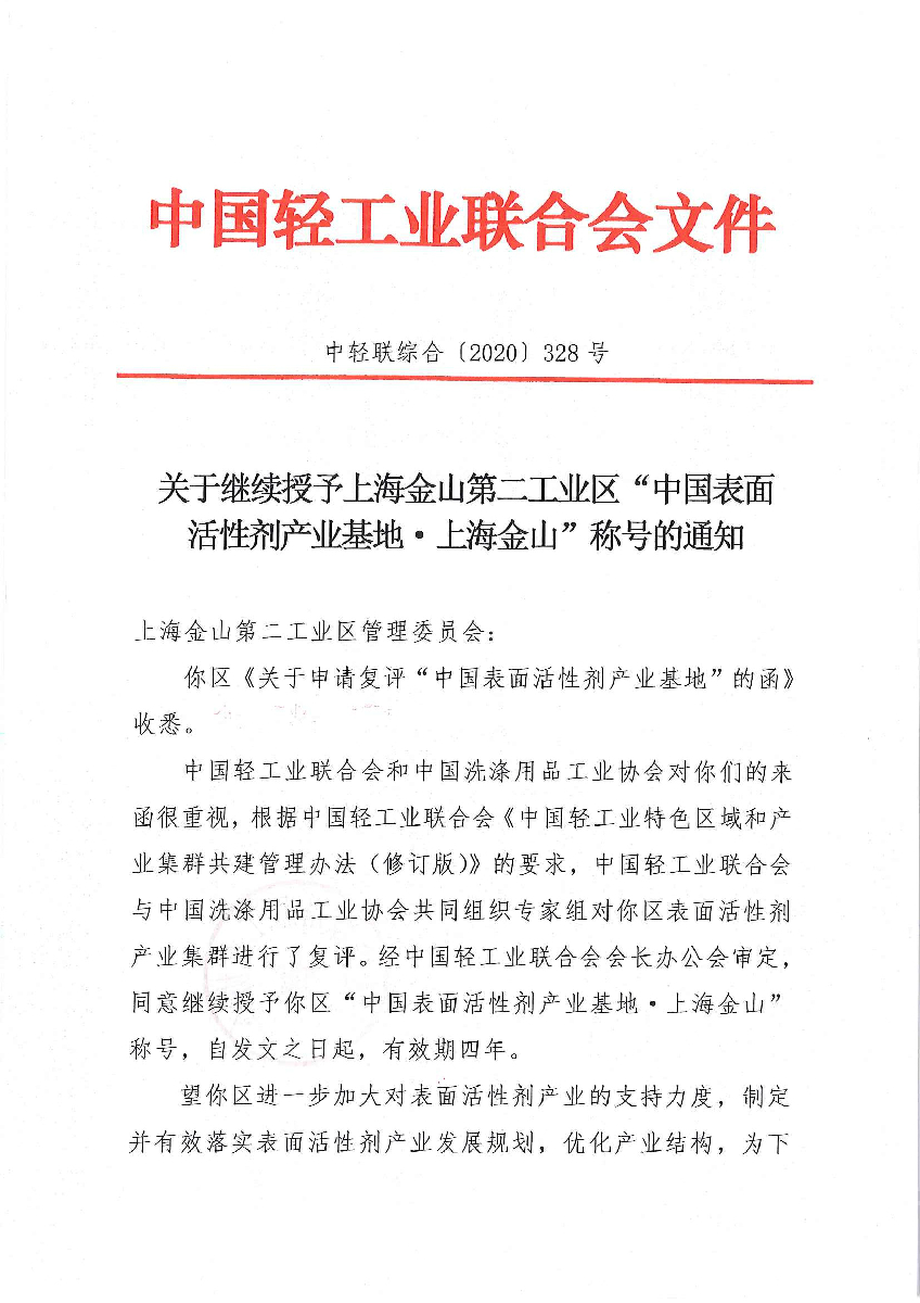 关于继续授予上海金山第二工业区“中国表面活性剂产业基地·上海金山”称号的通知