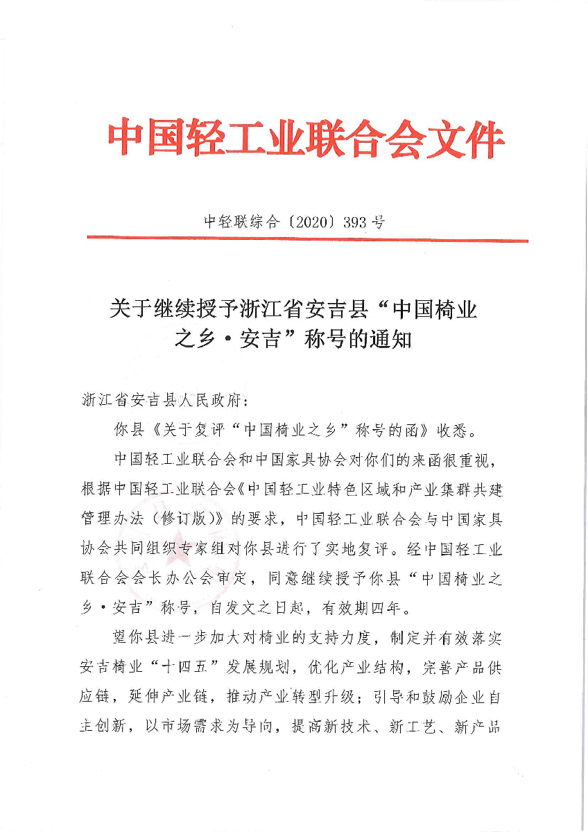 关于继续授予浙江省安吉县“中国椅业之乡·安吉”称号的通知