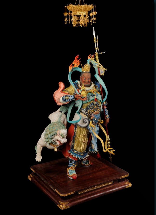 银质彩绘 高88厘米 作品继承了唐宋以来传统彩塑技艺与艺术风格,此组造像中天王头戴天冠,面色端严,身着金色铠甲,内衬天衣,左手执戟,右擎宝塔,身后奔腾一咆哮绿鬃白狮,从天而降,威震八方,一派天将风范 神马影院免费观看, 。