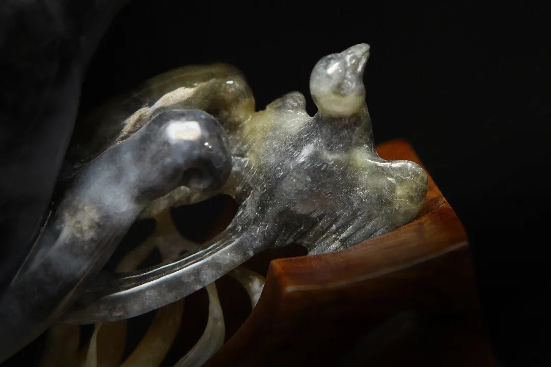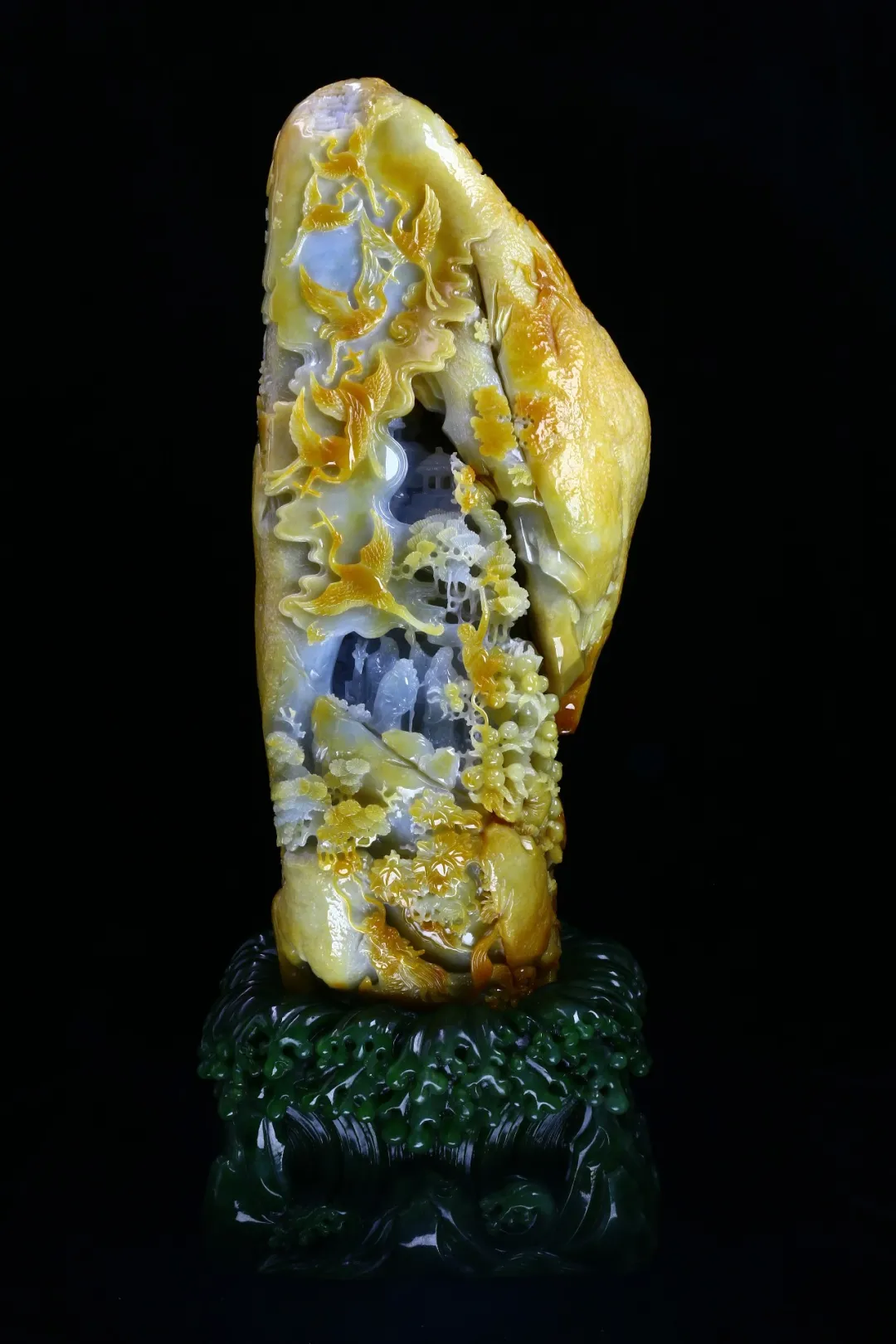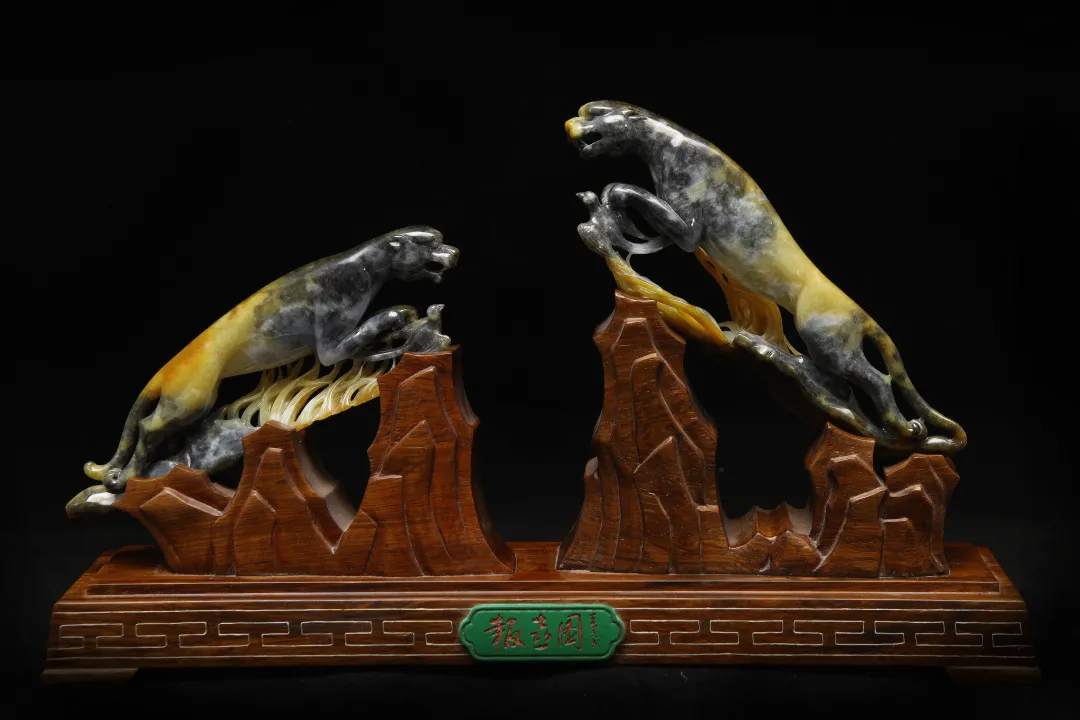 作品灵感来源于青铜器《马踏飞燕》 神马影视,原石为黄黑相间的怪桩料,豹子与喜鹊谐音“报喜”,飞奔的豹子脚踏喜鹊,传递佳作送喜的美好寓意, 。