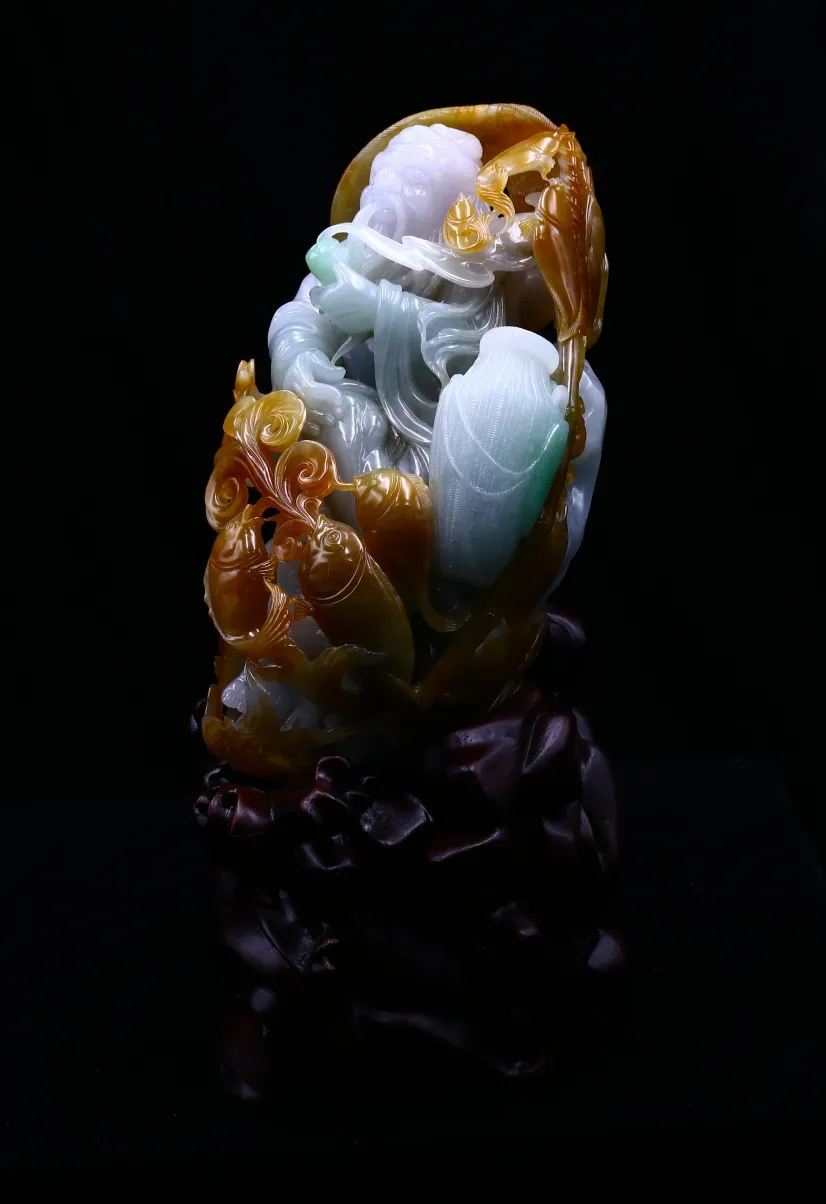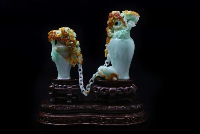 作品选用翡翠整料,颜色丰富,种水细腻,玉链环环相扣,玉瓶串联其上,瓶中雕刻四季花卉梅兰竹菊,寓意四季保平(宝瓶)安,瓶旁雕刻一对鹌鹑,寓意安居乐业,黄色俏色巧雕成蝙蝠,寓意福气临门 神马影院免费观看, 。