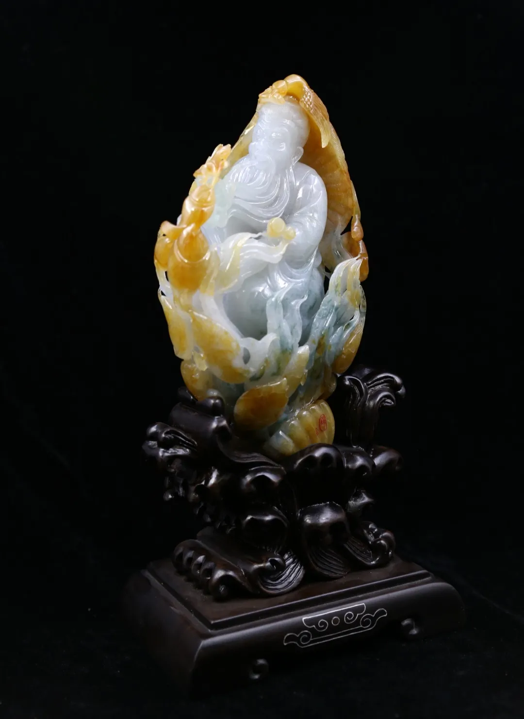 作品采用翡翠水石料,利用圆雕 神马在线,镂空雕技艺,俏色巧雕,丰富了画面的层次,充满动感,渔翁身背斗笠,手持烟斗,盘腿而坐,鱼鹰俯卧其上,鱼跃出水,呈现出悠然的水边美景, 。