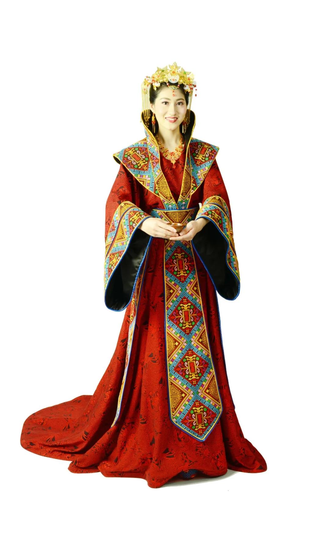 作品采用醇厚古朴,色彩斑斓的壮锦,以婚礼,婚宴为应用场景,设计制作而成 神马影视,服装风格或典雅素净,或雍容华贵,服装上绣壮锦“万寿花”,“龙凤纹” 等纹样,寓意着吉祥如意,福泰安康,作品将传统壮锦与现代时尚相融合,复古中彰显奢华与唯美,呈现出独特的民族风貌, 。