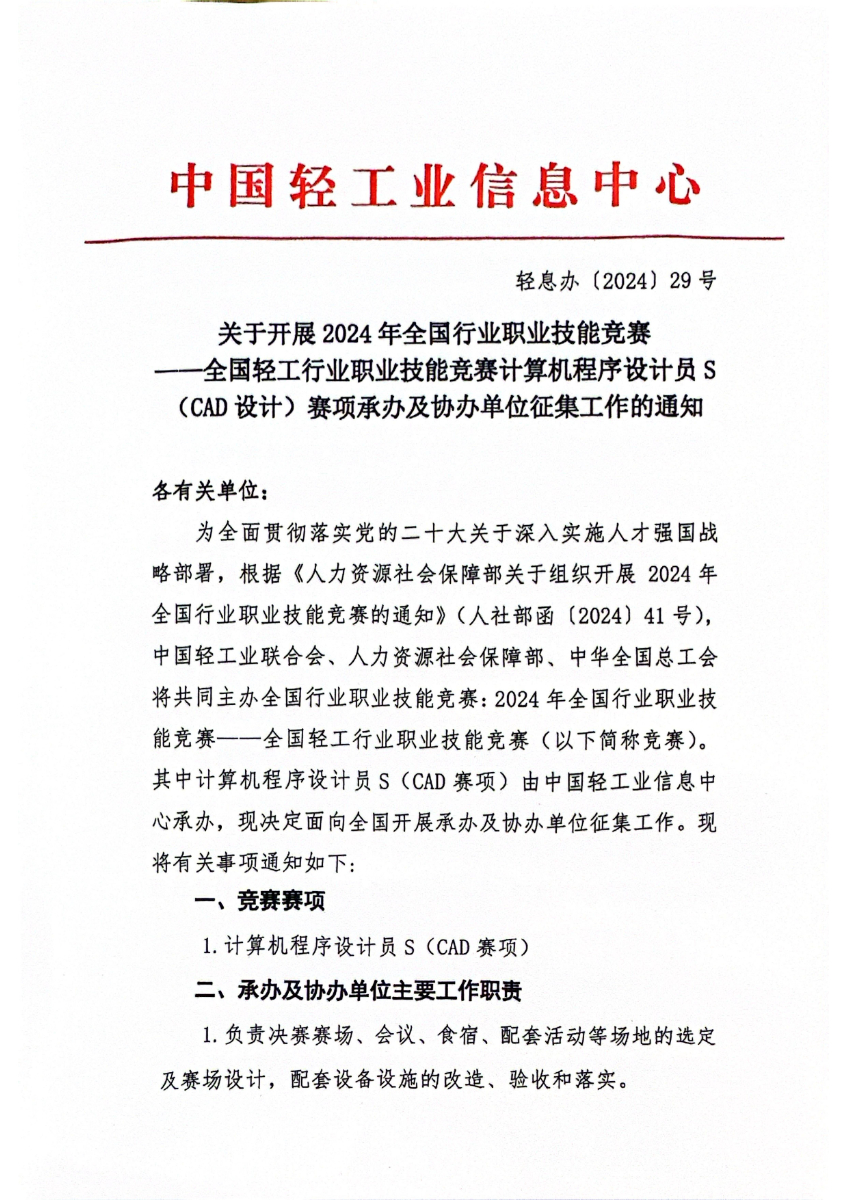 关于开展2024年全国轻工行业职业技能竞赛计算机程序设计员s(cad设计)赛项承办、协办单位征集工作的通知