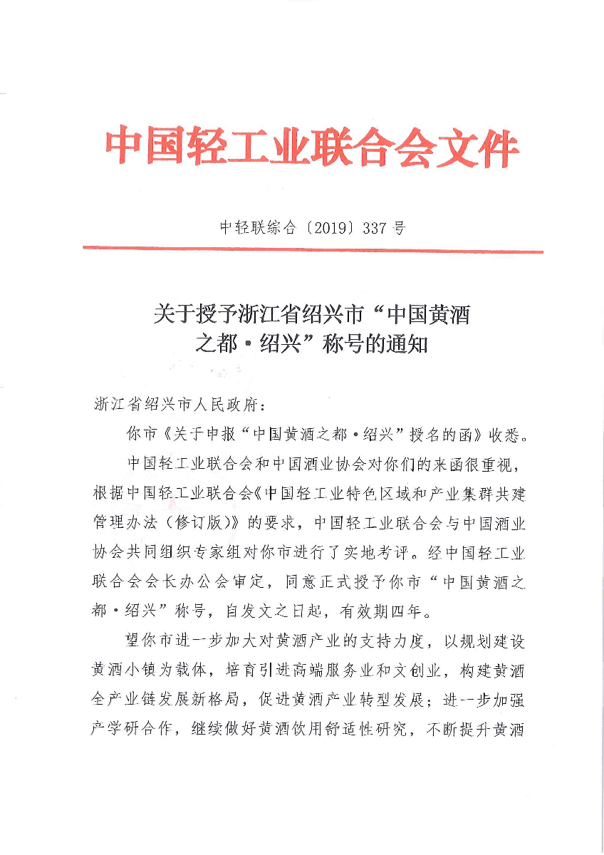 关于授予浙江省绍兴市“中国黄酒之都·绍兴”称号的通知