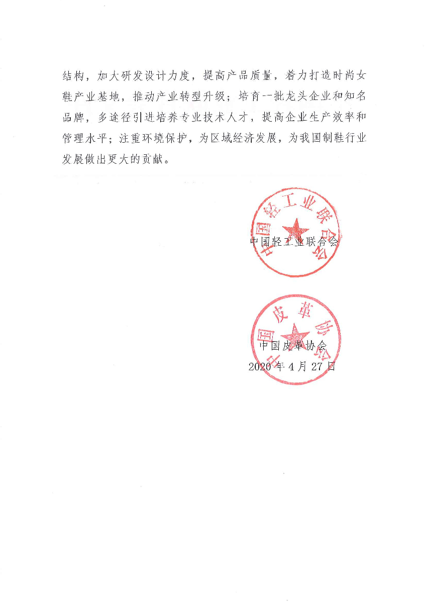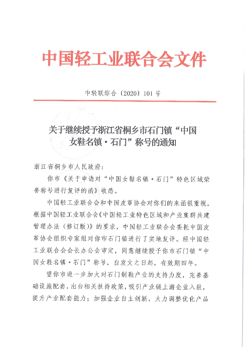 关于继续授予浙江省桐乡市石门镇“中国女鞋名镇·石门”称号的通知