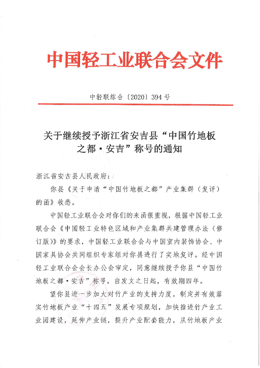 "神马在线" 关于继续授予浙江省安吉县“中国竹地板之都·安吉”称号的通知