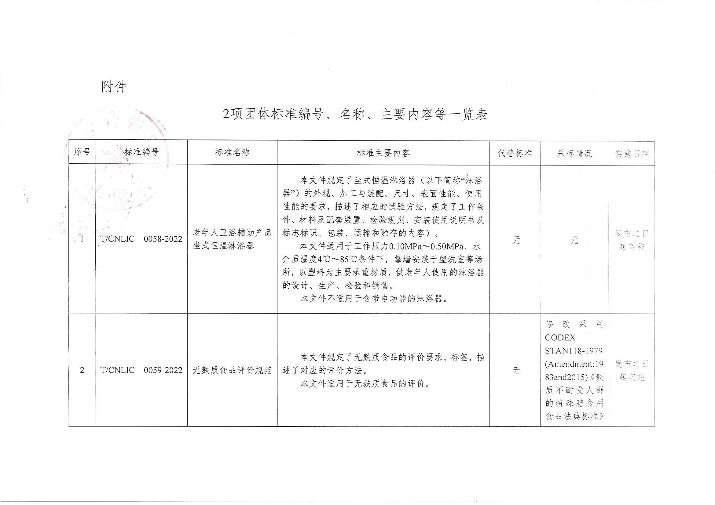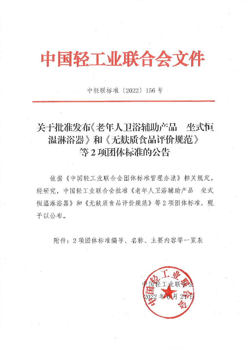 关于批准发布《老年人卫浴辅助产品 坐式恒温淋浴器》和《无麸质食品评价规范》等2项团体标准的公告