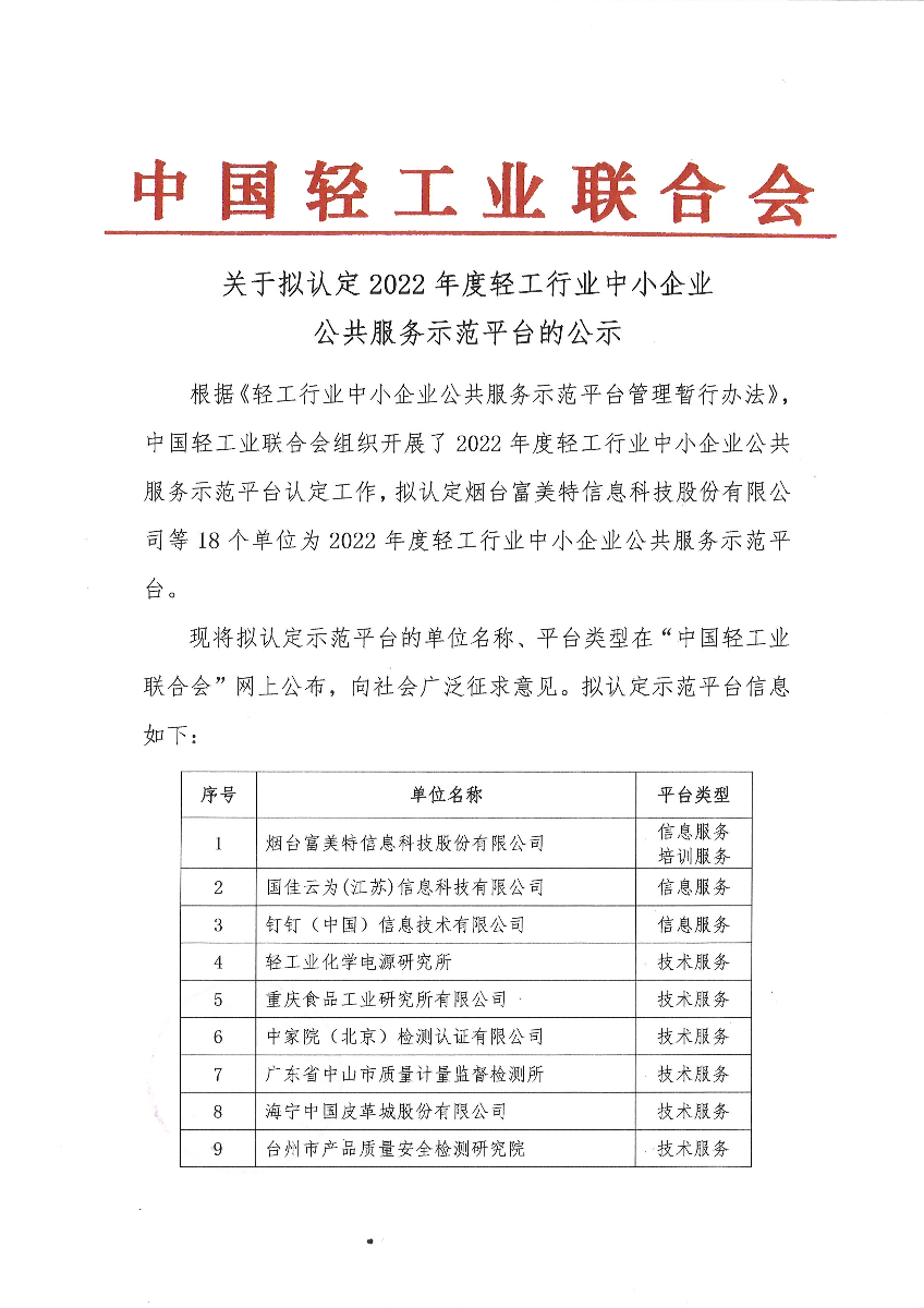 "神马在线" 关于拟认定2022年度轻工行业中小企业公共服务示范平台的公示