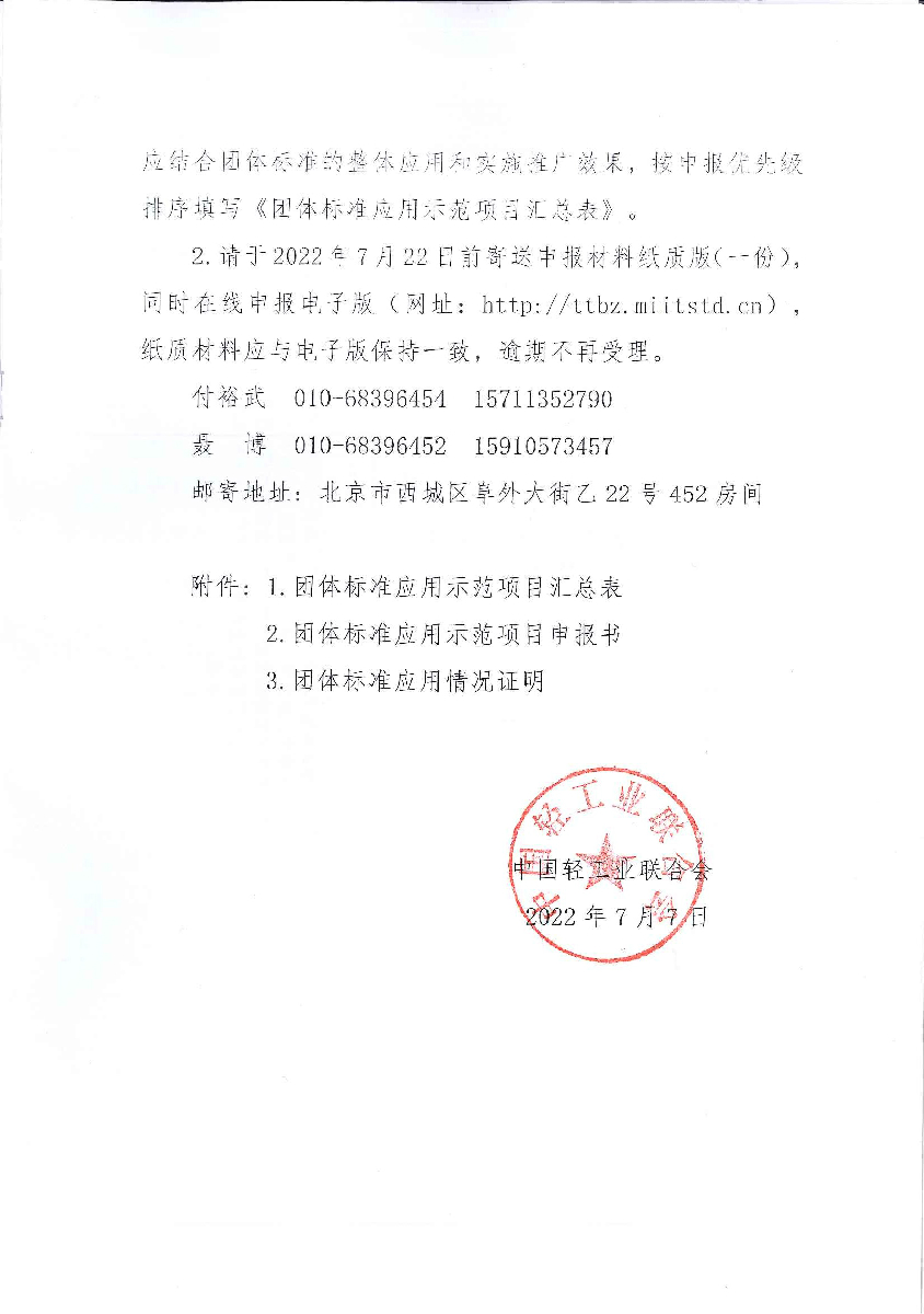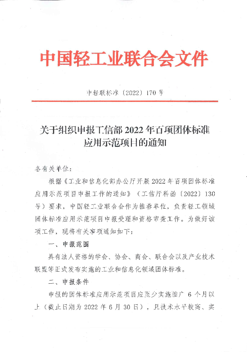 关于组织申报工信部2022年百项团体标准应用示范项目的通知