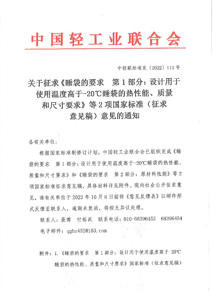 | 1、 | 《睡袋的要求 第1部分:设计用于使用温度高于-20℃睡袋的热性能、质量和尺寸要求》国家标准(征求意见稿) |