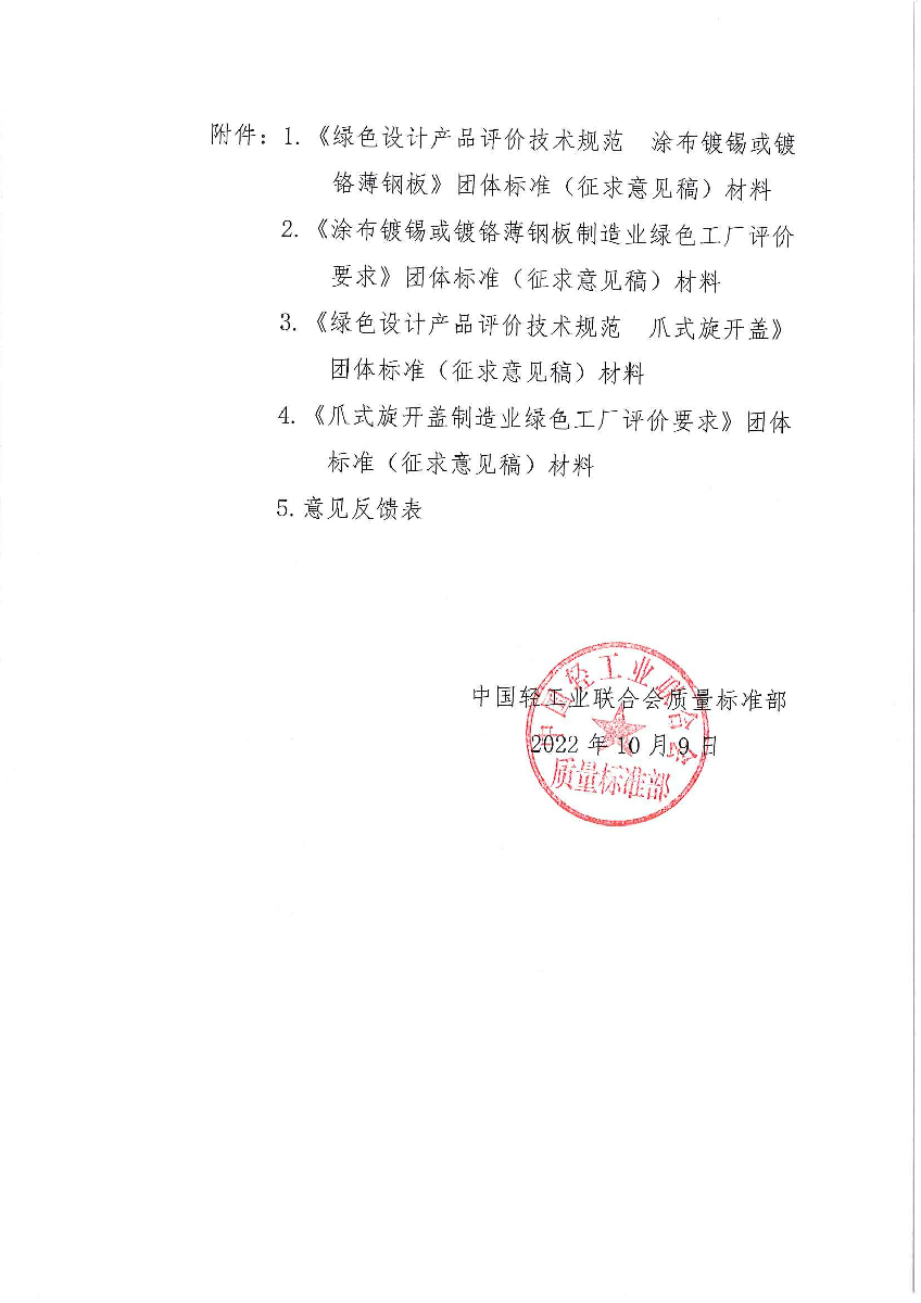 | 5、 | 《绿色设计产品评价技术规范 爪式旋开盖》团体标准(征求意见稿) |