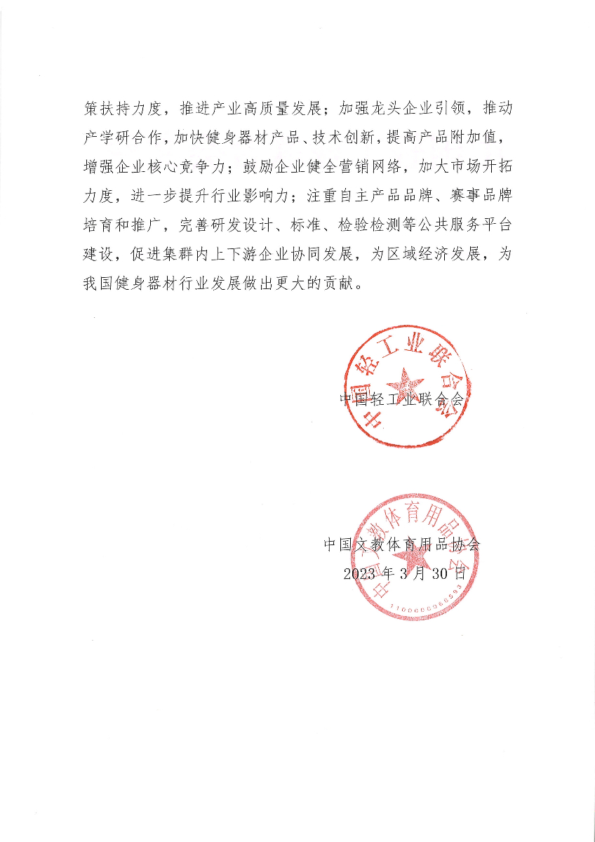 关于继续授予山东省宁津县“中国健身器材生产基地·宁津”称号的通知