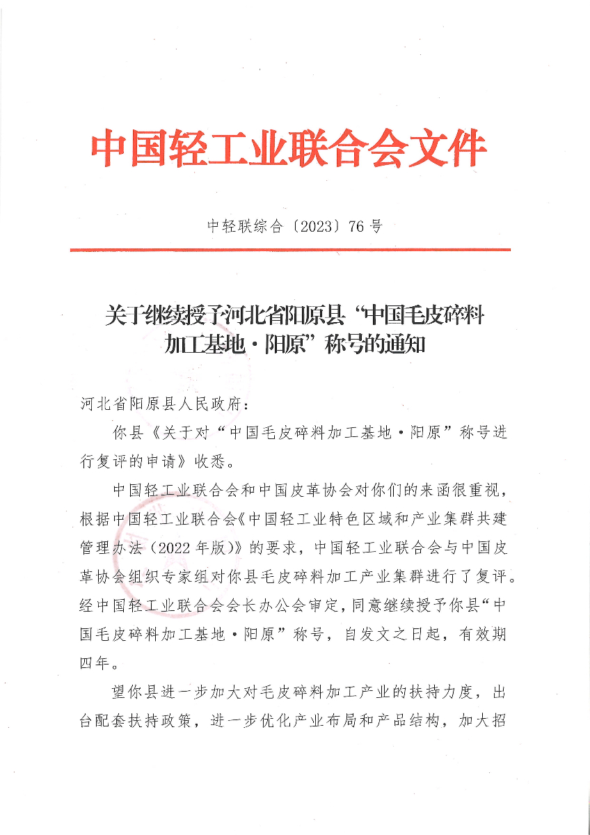 "神马影院免费观看" 关于继续授予河北省阳原县“中国毛皮碎料加工基地·阳原”称号的通知