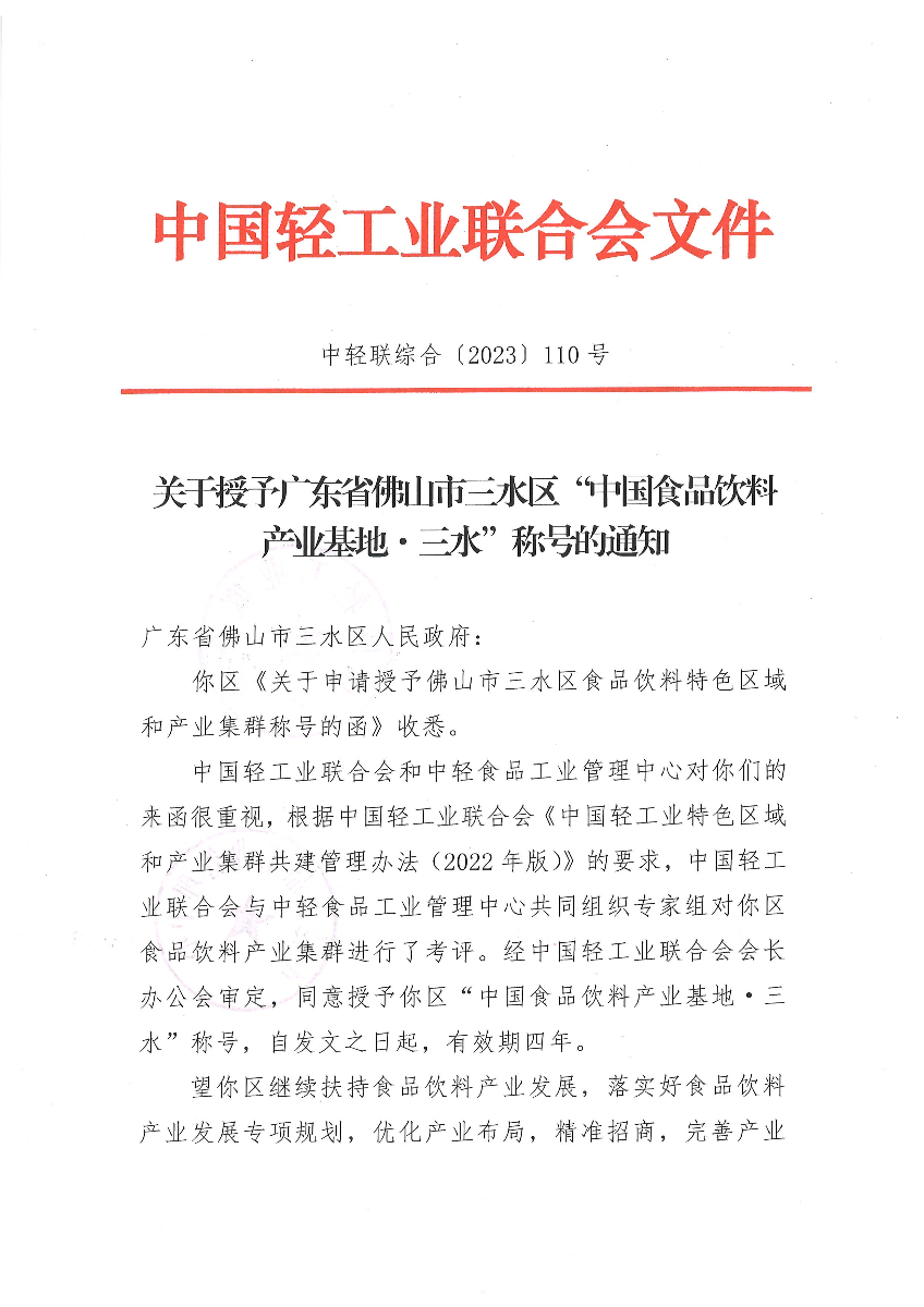 关于授予广东省佛山市三水区“中国食品饮料产业基地·三水”称号的通知