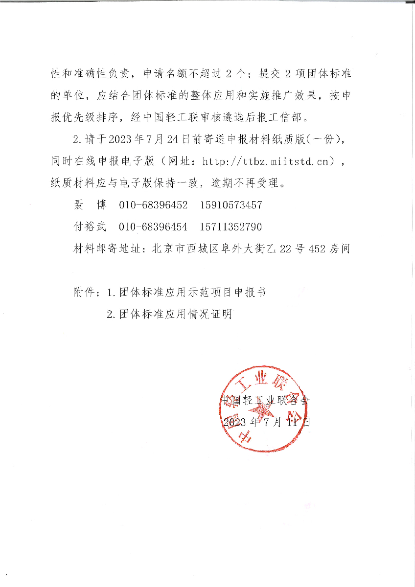关于组织申报工信部2023年百项团体标准应用示范项目的通知