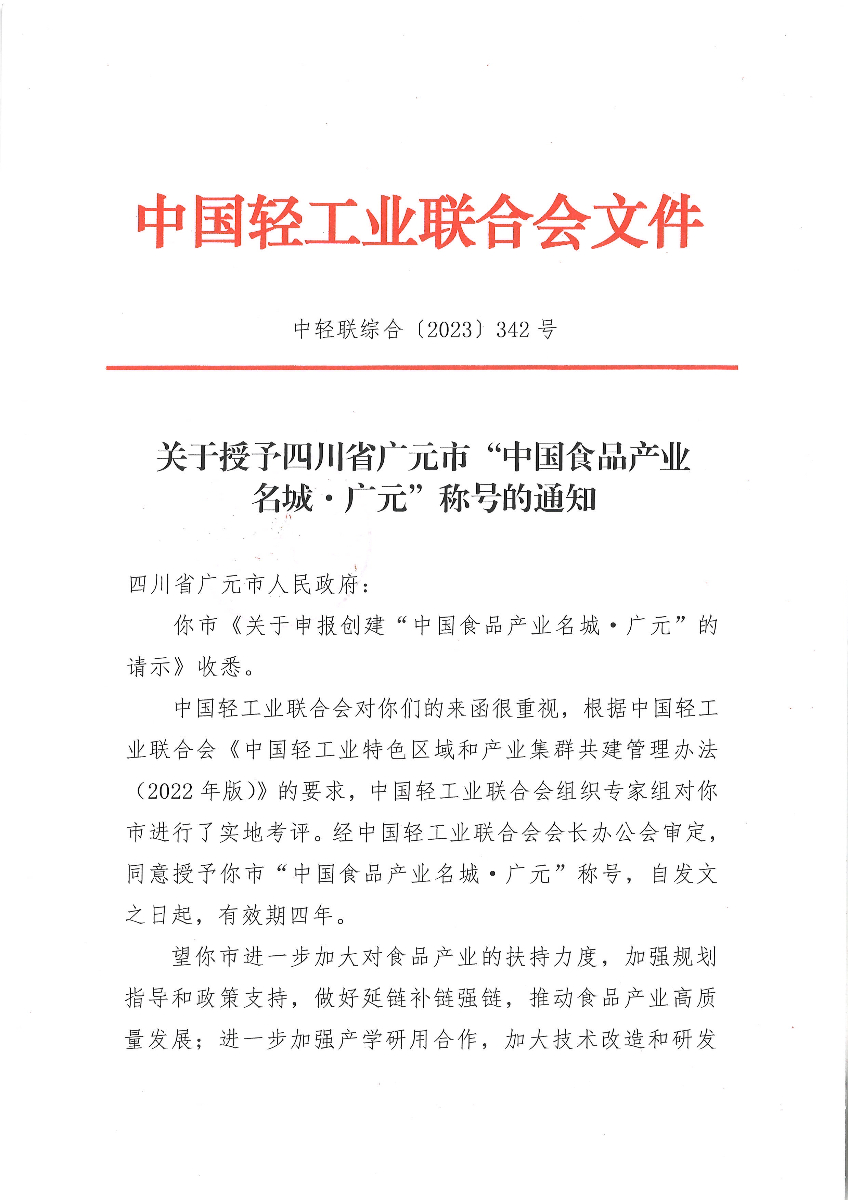 "神马影院高清" 关于授予四川省广元市“中国食品产业名城·广元”称号的通知