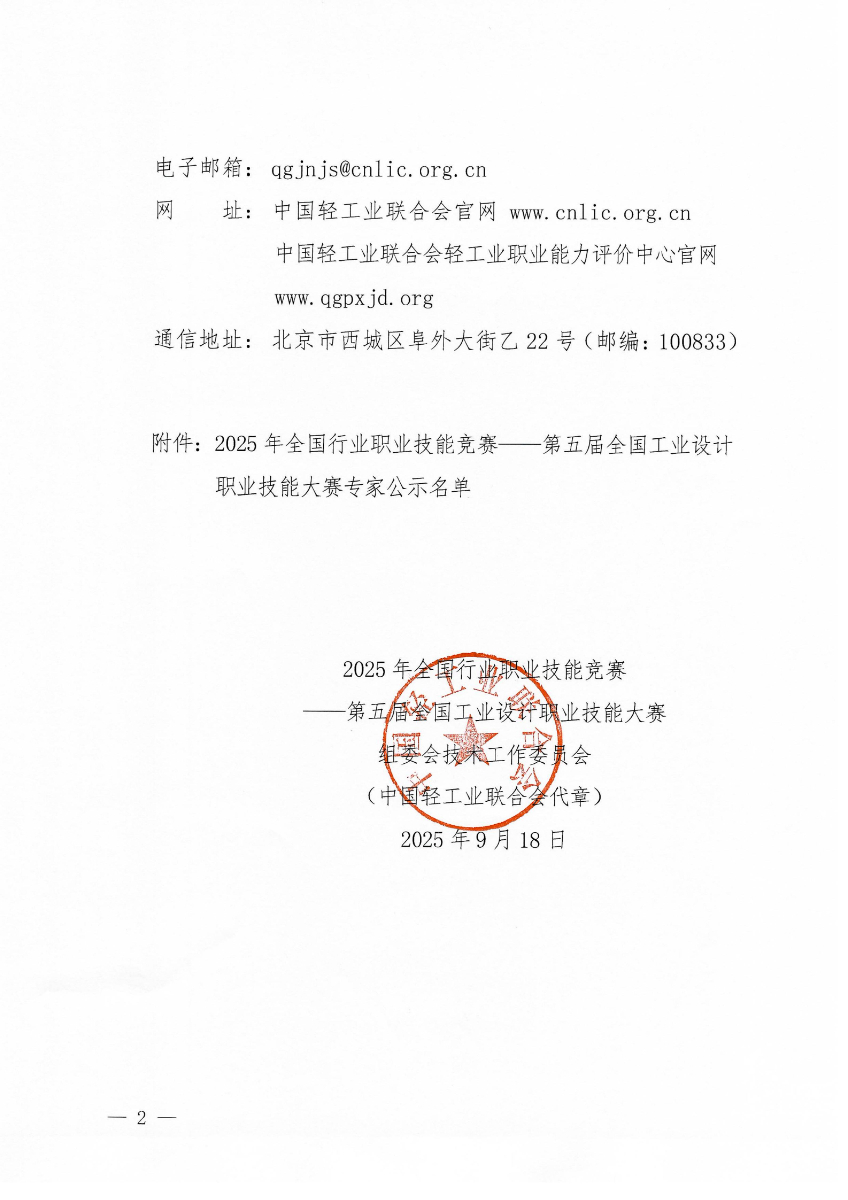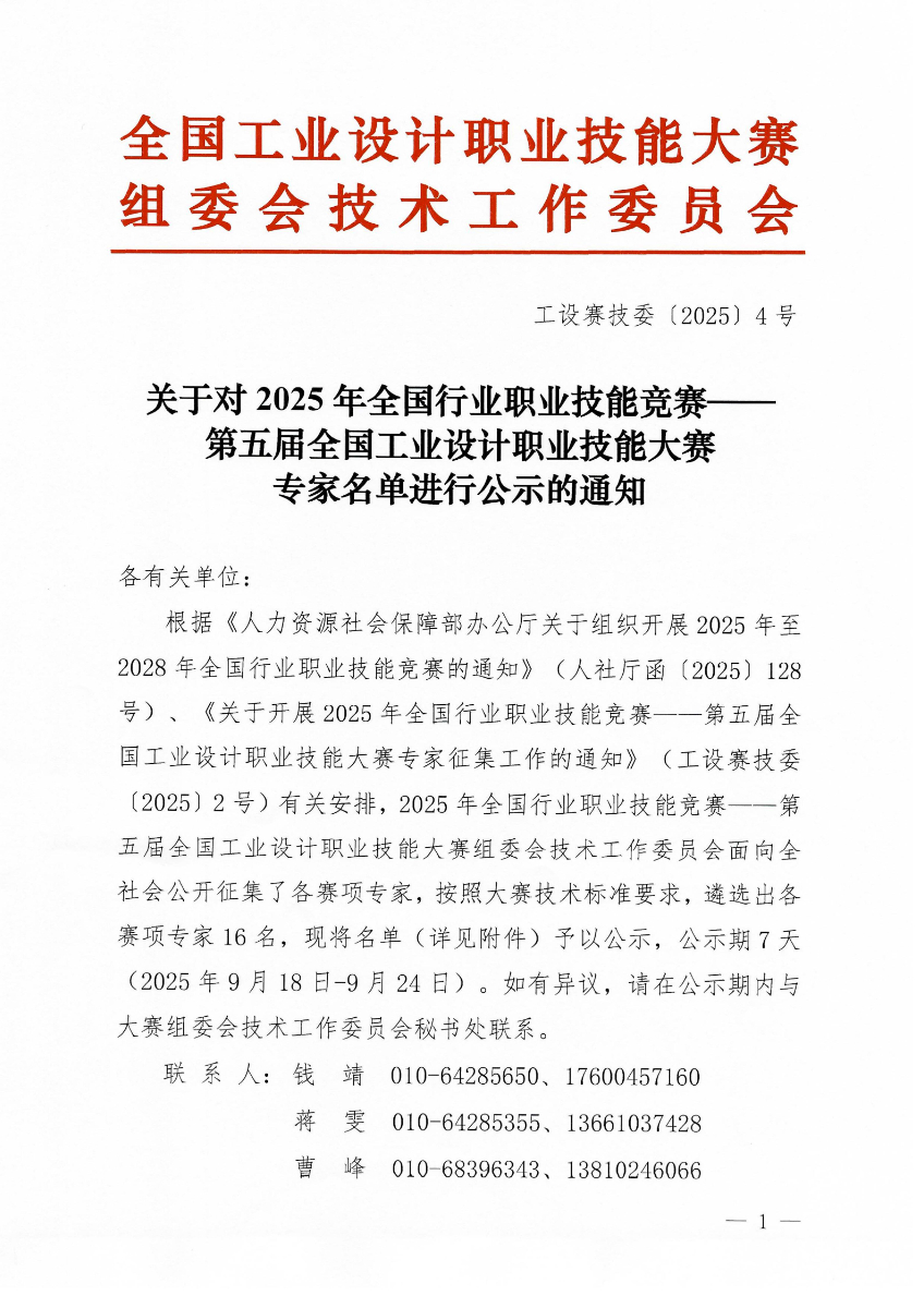 关于对2025年全国行业职业技能竞赛——第五届全国工业设计职业技能大赛专家名单进行公示的通知